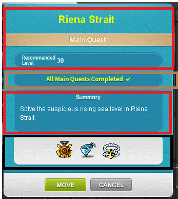In order from top to bottom: Name of the Dungeon: Reina Straight, Type: Main Quest, Recommended Level:30.
