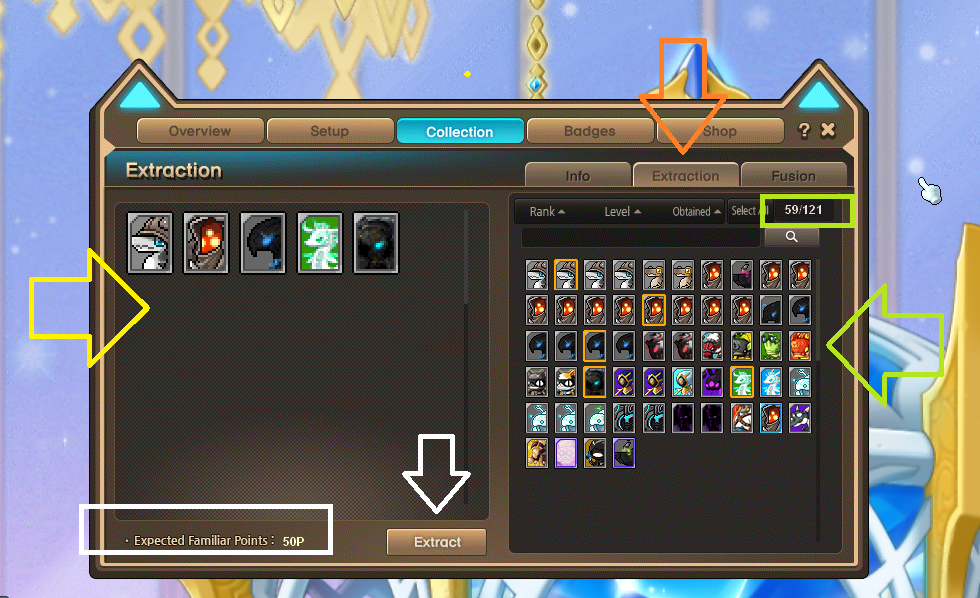 Is the list of Familiars you want to extract. The number of coins you will get for the shop is shown in the white box.